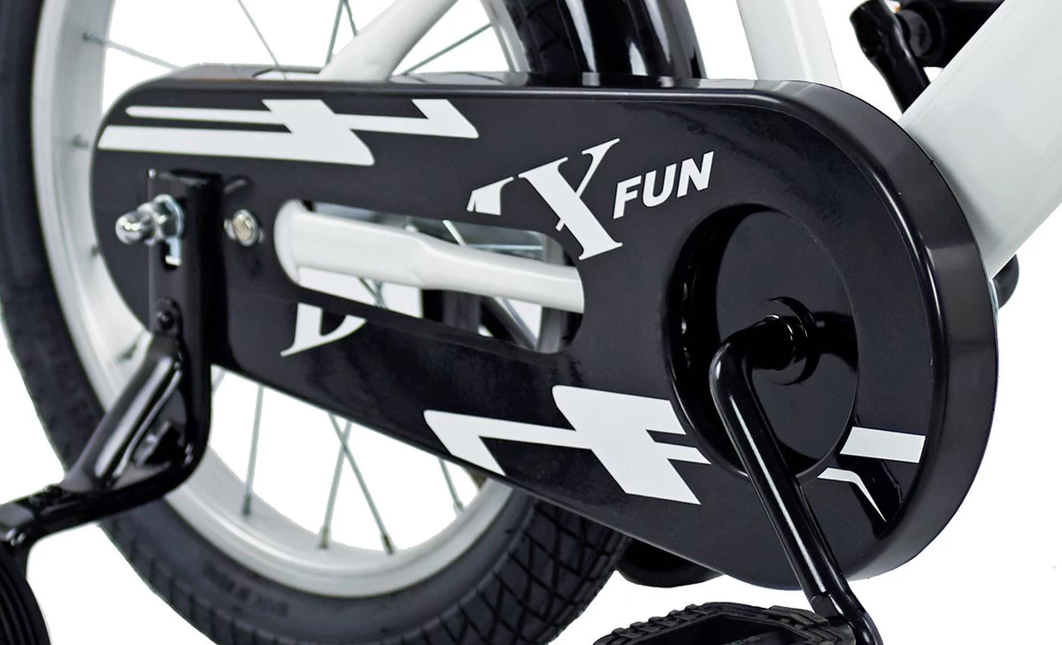 Stoere witte BMX-Fun jongensfiets met 16 inch wielen. De kinderfiets wordt geleverd met zijwielen die makkelijk verwijderbaar zijn als deze niet meer nodig zijn. Zowel het stuur als het zadel zijn in hoogte verstelbaar. De fiets wordt geleverd met een gesloten kettingkast, veilige handvatten (hoge rand) en bel.