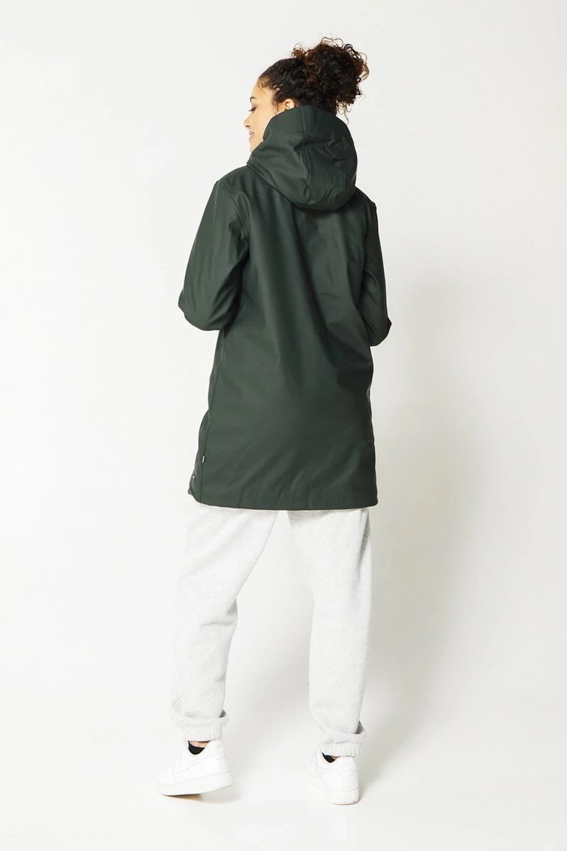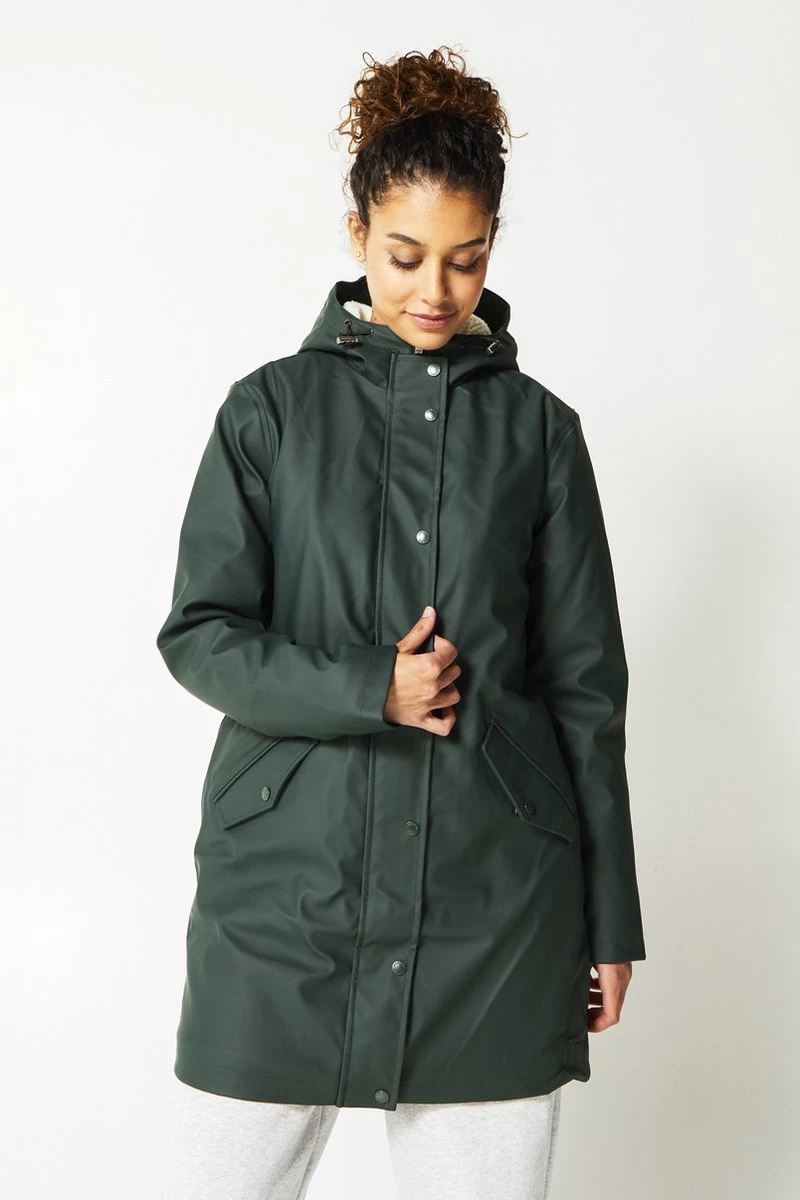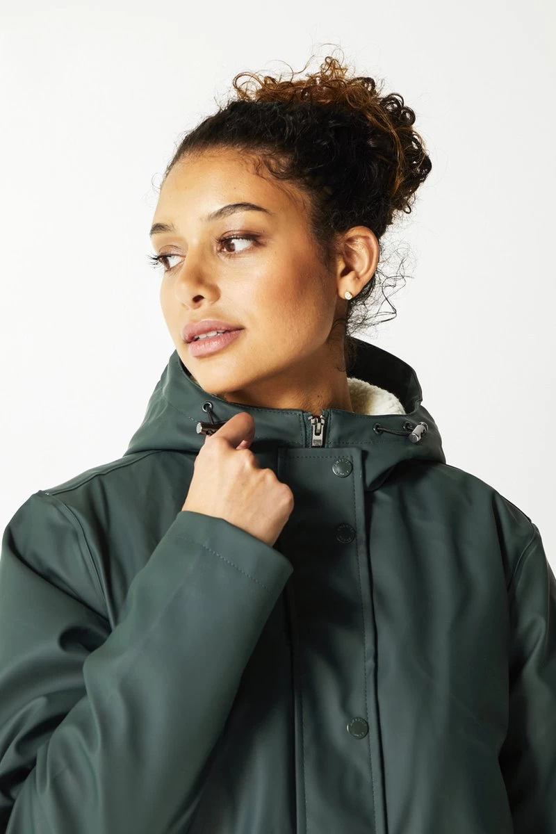 America Today dames regenjas. De Janice teddy is een lange regenjas met capuchon ideaal voor op de fiets. De capuchon kan doormiddel van een trekkoord aangetrokken worden voor extra bescherming. Daarnaast is de regenjas voorzien van een rits- en drukknoopsluiting en twee steekzakken met drukknoopsluiting. De teddy binnenstof houd je lekker warm tijdens de koude regen dagen. Product details: • Straight fit • Vaste capuchon • Teddy binnenkant • Rits- en drukknoopsluiting