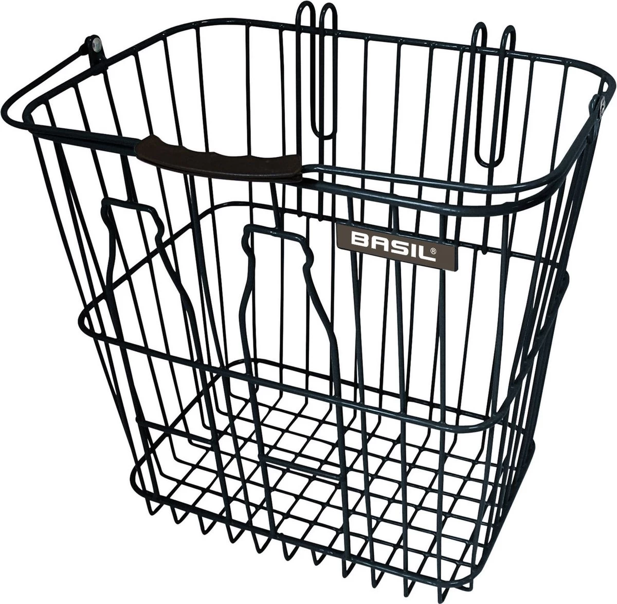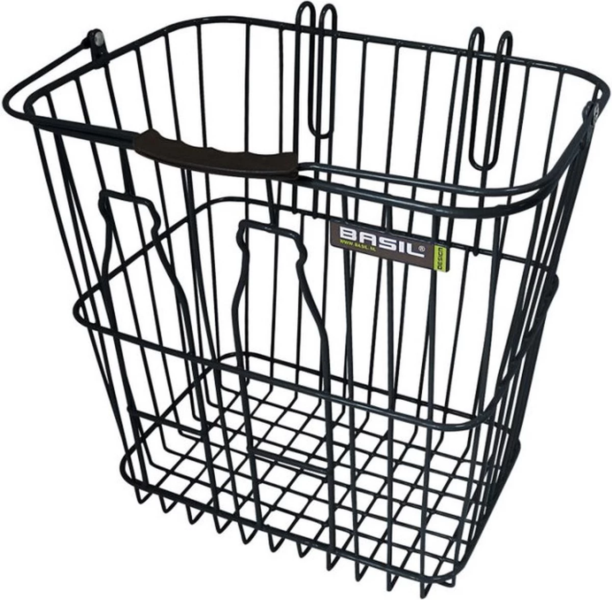De Basil Memories Bottlebasket is een afneembare fietsmand van draadstaal en voorzien van veilige dubbele haken om aan de bagagedrager te hangen. De mand is superhandig bij het doen van boodschappen, voor het halen van groenten op de wekelijkse markt of als je veel flessen of pakken drinken mee neemt vanuit de winkel of juist wilt inleveren bij de flessenautomaat. Deze fietsmand uit de Basil collectie is voorzien van een praktisch draaghengsel en valt vooral op vanwege zijn zwarte kleur. Je hangt de mand zijdelings aan de drager door middel van haken. Bovendien is de mand gemakkelijk mee te nemen bij het doen van een boodschap in de winkel. Dankzij het hengsel met kunststof handgreep hoef je niet onnodig te slepen met verschillende tassen, maar stop je direct alles in de fietsmand. Het melkflessen-motief dat in de fietsmand is verwerkt zorgt vanzelfsprekend voor een stukje nostalgie. Hoe vaak kwam de mobiele supermarkt bij je langs in de week? Wil je een opvallende fietsmand voor aan de bagagedrager van je fiets? De Basil Memories Bottlebasket met zijn opvallende kleur is een aanwinst voor jouw dames- of herenfiets. Neem ook zeker een kijkje bij de andere modellen uit de Basil collectie. Eigenschappen: De mand is dankzij de zwarte kleur een opvallende verschijning. De fietsmand is voorzien van dubbele haken om te bevestigen aan de bagagedrager van je fiets. Dankzij het hengsel met kunststof grip neem je de mand overal mee naartoe. Supermakkelijk! Je hangt de mand aan zijdelings aan de bagagedrager, kies voor een kant die voor jou prettig voelt!