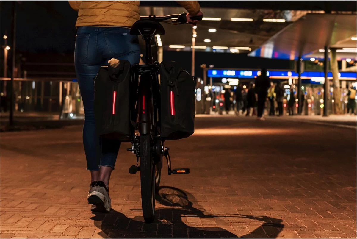Ben je op zoek naar een ruime fietstas die er ook nog eens mooi uitziet? Dan is de Basil SoHo dubbele fietstas Nordlicht in de mosgroene kleur echt iets voor jou. Gemaakt van mat PU-materiaal dat erg zacht aanvoelt* met een inhoud van 41 liter. De tas is waterdicht (IPX3), waardoor jij jouw spullen altijd droog meeneemt. De tas sluit je af met een roltop die je aan de zijkanten van de tas met drukknopen bevestigt. Aan jouw veiligheid is ook gedacht. De tas is namelijk voorzien van Nordlicht Technology**, een geïntegreerde LED-strip. Zo val je in het donker beter op. De LED-verlichting werkt op 3x AAA batterijen (apart verkrijgbaar). Heb je veel en zwaardere spullen in je tas? Dan kun je de tas combineren met de Basil Afstandhouder (apart verkrijgbaar). Deze houder voorkomt dat de tas in de spaken van je fiets komt. Je bevestigt de Basil SoHo dubbele fietstas eenvoudig op je bagagedrager met het Universal Bridge systeem. Dankzij het Universal Bridge systeem kun je kiezen uit hoe je de tas wilt bevestigen. Het bevestigen kan met de voorgemonteerde riempjes. Of in combinatie met het Basil DBS systeem (afneembare bagagedragerplaten) of een adapterplaat zoals MIK. Beide systemen dien je apart aan te schaffen. Eigenschappen: Waterdichte dubbele fietstas inclusief roltopsluiting. Voorzien van geïntegreerde LED-verlichting (batterijen apart verkrijgbaar). Ruime inhoud van 41 liter totaal. Gemakkelijk te bevestigen op (bijna) elke bagagedrager, dames-, herenfiets en elektrische fiets. *Schuren tegen wat ruwere oppervlakten kan ervoor zorgen dat het materiaal beschadigt. De tas blijft ook dan waterdicht met dezelfde hoge IPX3 norm. **Nordlicht Technology kun je gebruiken als een aanvullende verlichting en treedt op geen enkele wijze in de plaats van de wettelijk vereiste fietsverlichting. Voor het gebruik van alle verlichting dien je te allen tijde de wettelijke regels met betrekking tot fietsverlichting van het land op te volgen.