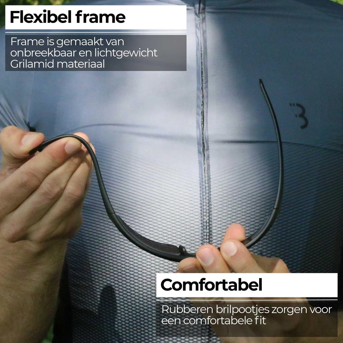 Hi-impact polycarbonaat frame met instelbaar rubberen neusstuk.