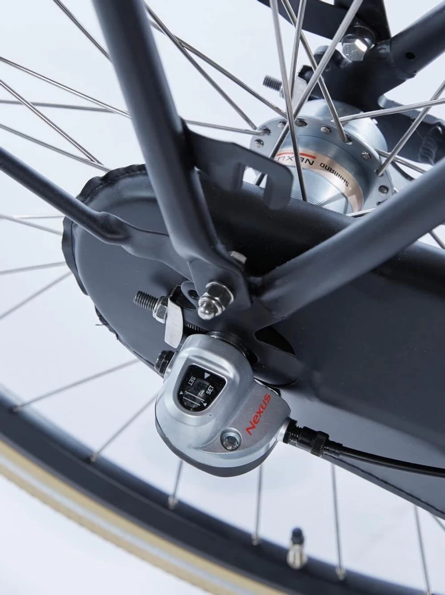 Cortina Transport U4 damesfiets in framemaat 50cm. Kleur: Jet Black Matt. Uitgerust met achter een Shimano Nexus 3-traps versnellingsnaaf met terugtraprem en voor een standaard naaf. Opvallende details: aluminium frame, stuurslot, voordrager.