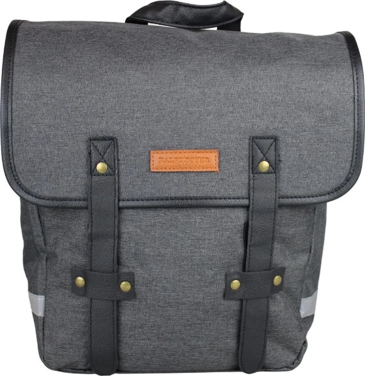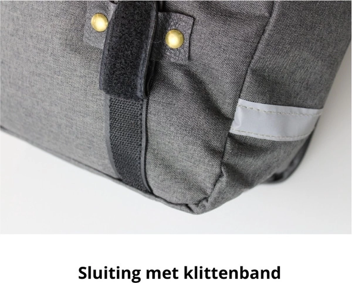 Kleine dubbele fietstas in de kleur donkergrijs/zwart. Wil je een niet al te grote fietstas, die je overal gemakkelijk kunt meenemen en dragen, dan is dit de ideale fietstas. De fietstas kan eenvoudig door de klittenbandsluitingen van de fiets afgehaald worden en bevestigd worden. De fietstas heeft aan beide kanten een bodem, dit maakt de tas steviger. Daarnaast heeft de fietstas aan beide zijkanten een reflector, veilig voor in de avonden. Handvat aan de bovenkant, zie je niet vaak maar is wel erg handig tijdens het afhalen + dragen van de tas. Kortom een leuke kleine fietstas, geschikt voor iedereen!