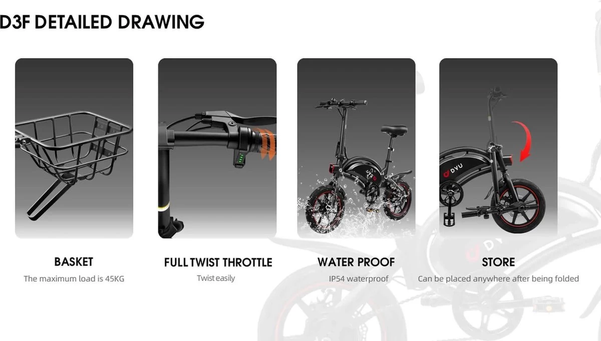- ☆ 【Batterij met grote capaciteit & hogesnelheidsmotor】 De DYU D3F elektrische fiets heeft een 240W borstelloze full-disk motor, kan stabiele en voldoende rijkracht bieden, en de snelheid kan tot 25 km/u bedragen, 36V 10AH verwijderbare lithiumbatterij met hoge capaciteit duurt slechts 3-4 uur per lading, wat ongeveer 25-45 kilometer rijkilometers kan leveren.