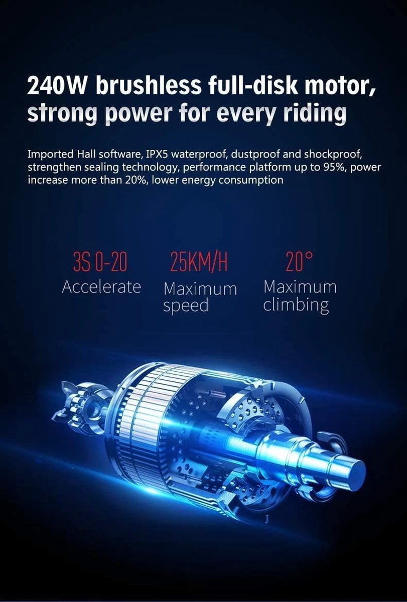 - Lichtgewicht en opvouwbaar: de behuizing van onze elektrische fiets is gemaakt van hoogwaardig metaal, dat licht in gewicht en sterk is in stabiliteit, zorgvuldig gebouwd met 58 procedures, met een gewicht van 17.2 kg. het kan ook met één hand worden opgetild. De breedte is slechts 200mm na gevouwen, gemakkelijk in de kofferbak te plaatsen.