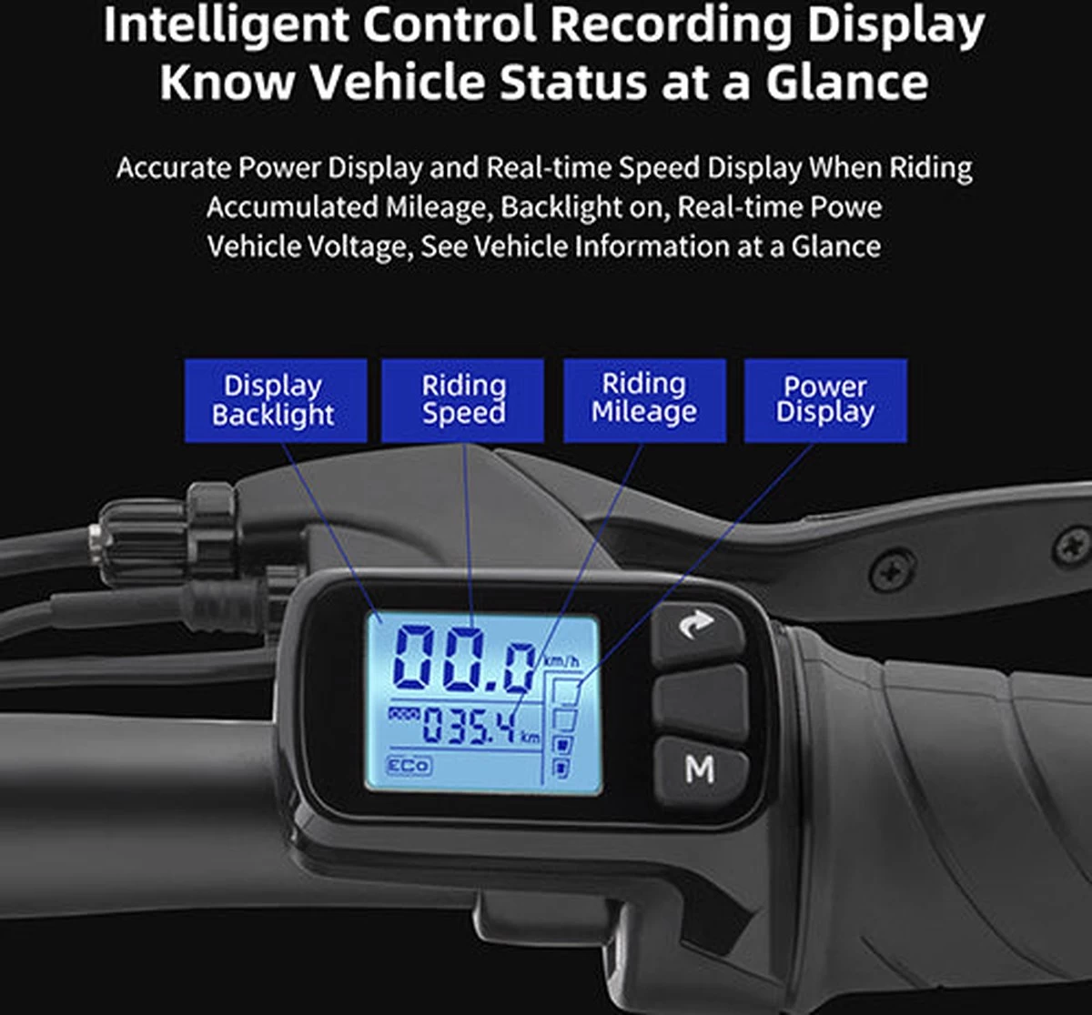 Weergave: batterij, kilometerteller, dagteller, snelheid, diagnose en koplampactivering.