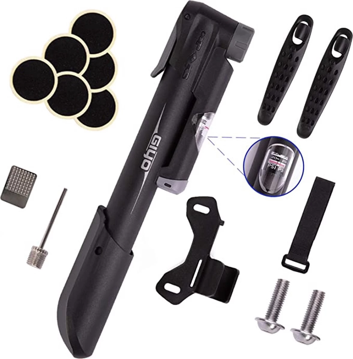 De Giyo Fietspomp Mini wordt geleverd met een handige reparatieset, ideaal voor noodgevallen wanneer een fietsband onderweg knapt. De bandenplakset in de doos bevat voldoende materiaal voor 5 plakbeurten en de anti-scheur bandenplakkers zijn gemaakt van hoogwaardige kwaliteit zonder de noodzaak van extra lijm. Bovendien zijn er 2 kunststof bandenlichters inbegrepen, waardoor het gemakkelijk wordt om de binnen- en buitenband van de fiets los te koppelen. De buigbare fietspomp is voorzien van een ventielkopstuk dat geschikt is voor gebruik op zowel Presta, Schrader en Dunlop ventielen. Zorg ervoor dat de slang diep op het ventiel zit voor het meest efficiënte resultaat. Ook is er een naaldventiel inbegrepen voor het oppompen van sportballen zoals basketballen, voetballen, volleyballen en nog veel meer.