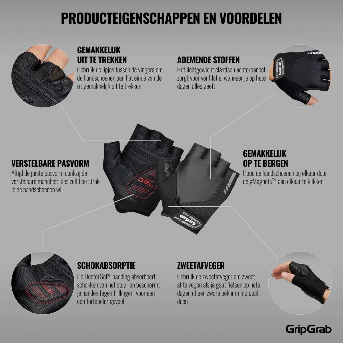 De GripGrab ProGel-fietshandschoenen met korte vingers behoren tot de comfortabelste fietshandschoenen voor de zomer. De van lichte en kwalitatieve materialen gemaakte fietshandschoenen bieden maximale bewegingsvrijheid en een uitstekende pasvorm. De antislip-handpalmen zijn voorzien van schokdempende, 4 mm dikke Premium DoctorGel-padding, waardoor vermoeide en gevoelloze handen tot het verleden behoren. Zo heeft men steeds een optimale grip op en maximale controle over het stuur. Na de rit kan men de wielerhandschoenen gemakkelijk uittrekken dankzij het slim geïntegreerde pull-off systeem, terwijl de gMagnets ervoor zorgen dat de handschoenen bij elkaar blijven bij het opbergen.
