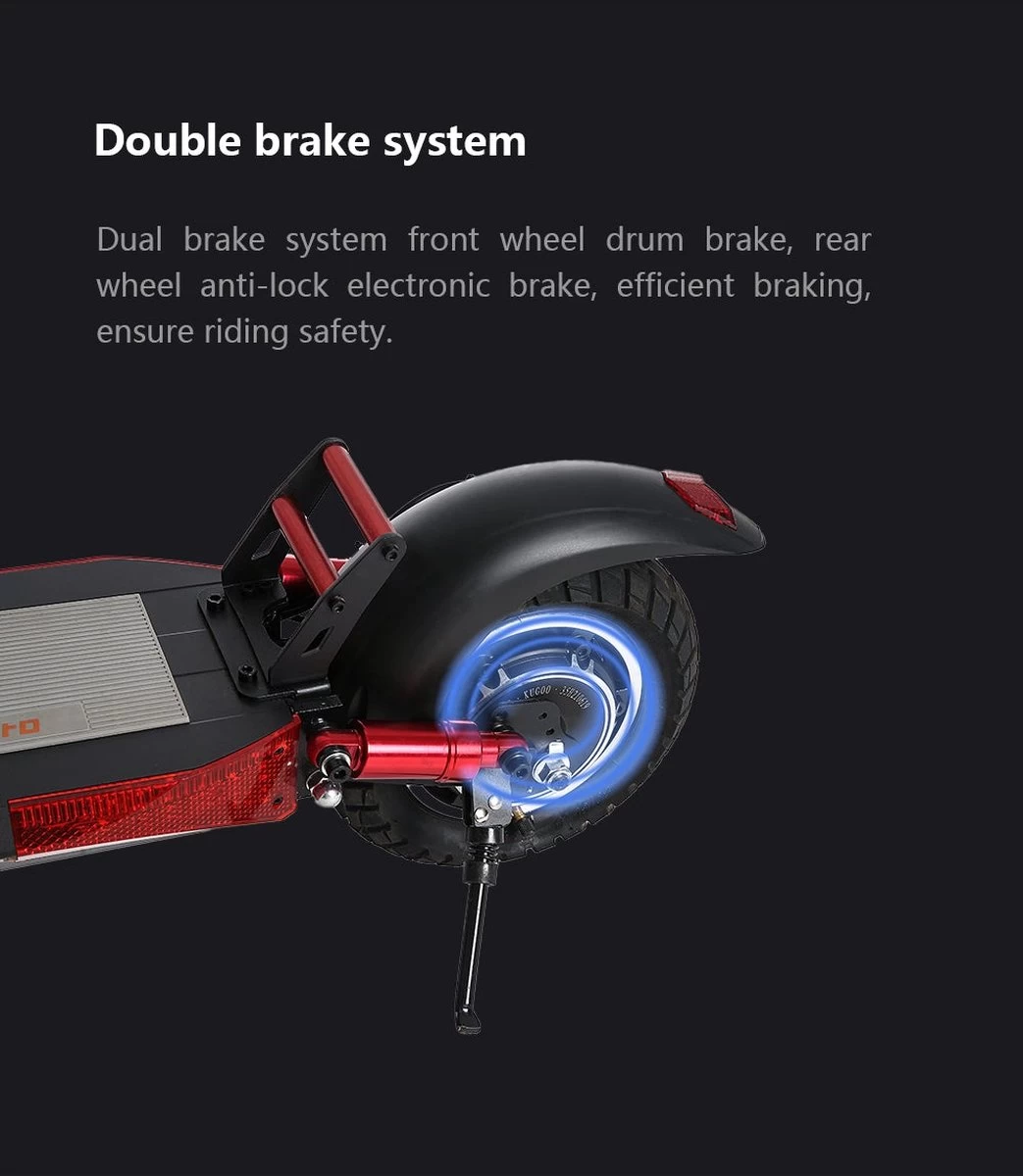 – Drievoudig Remsysteem: De elektrische scooter is uitgerust met dubbele schijfrem op het voorwiel en het achterwiel.