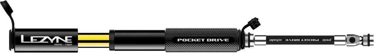 De Lezyne Pocket Drive is een extreem compacte en lichte minipomp voor de fiets zonder af te doen aan prestaties. De maximale pompdruk van deze kleine pomp is maar liefst 11 bar! De pomp kan deze druk bewerkstelligen doordat het gemaakt is van CNC gefreesd aluminium. Het handvat is geribbeld voor extra grip tijdens het pompen. Verder bevat de pomp een ABS Flex Hose die geschikt is voor Presta en Schrader ventielen. Met deze Flex Hose kun je ook weer lucht uit je band laten lopen met een simpele druk op de knop.