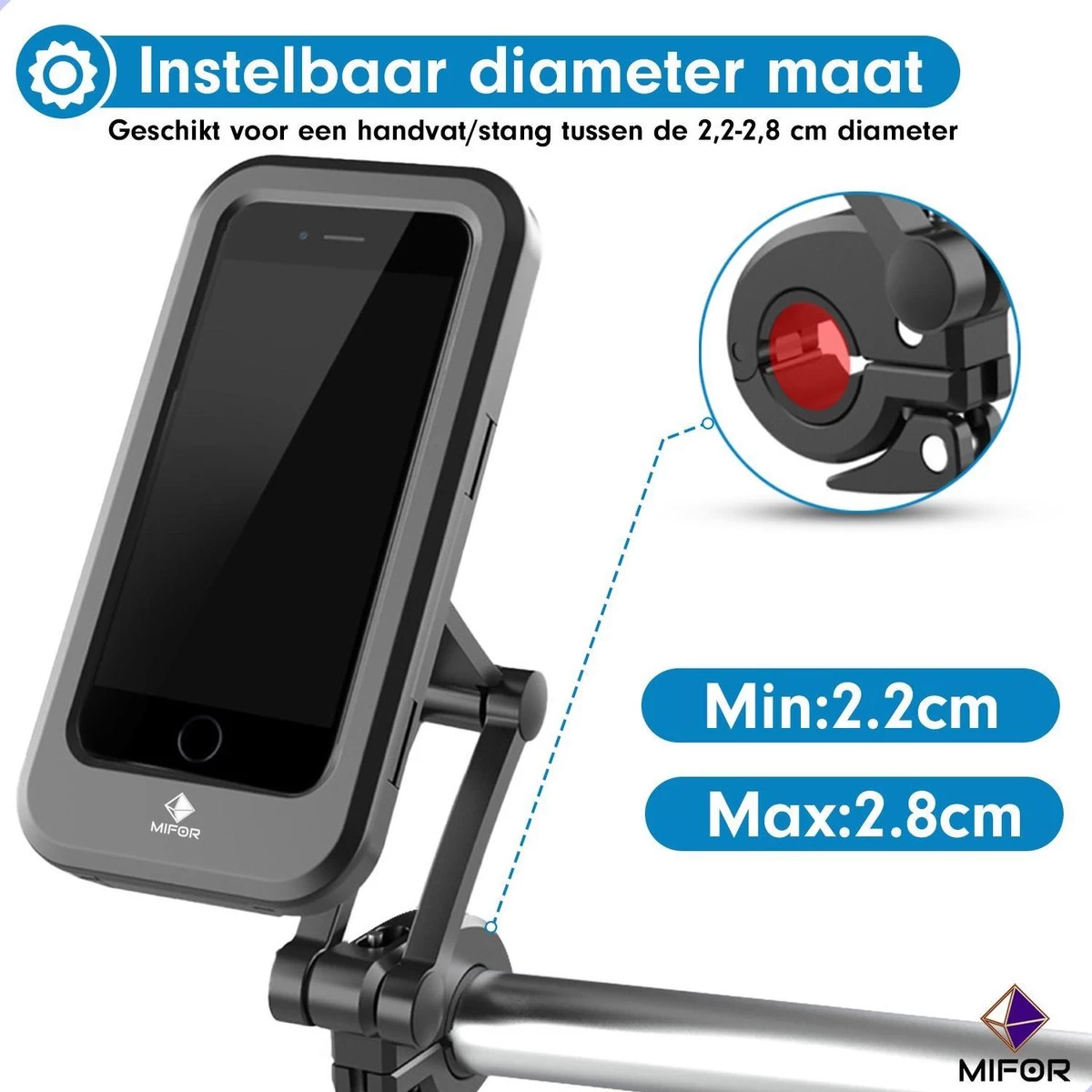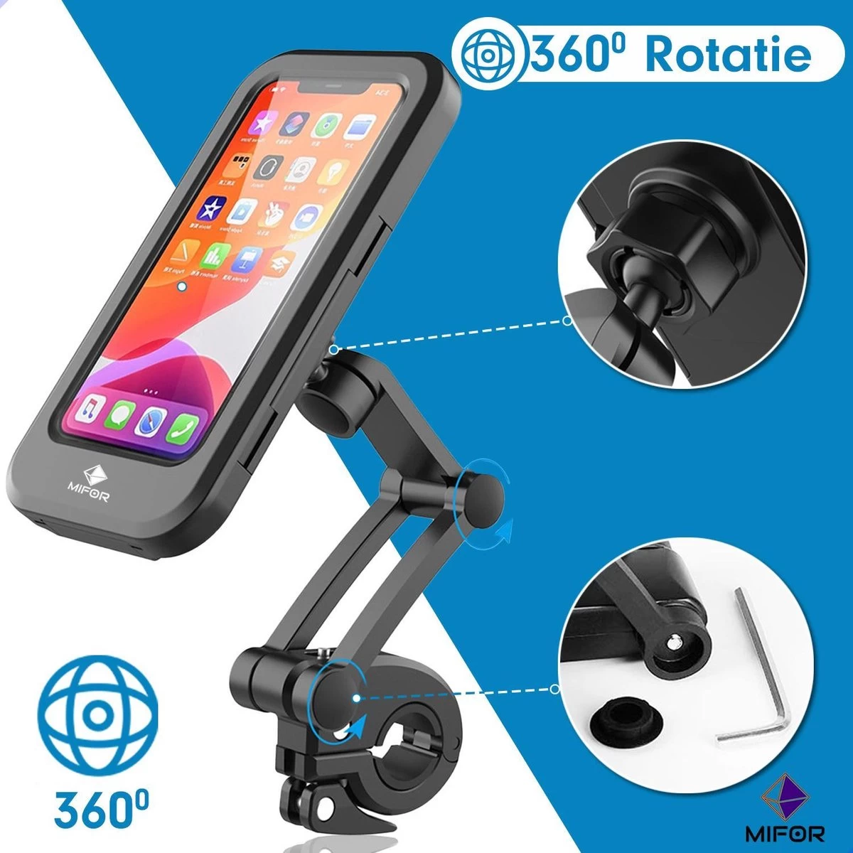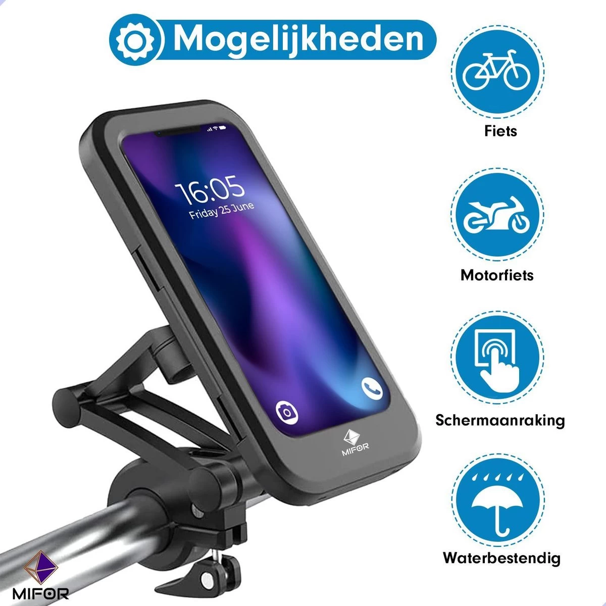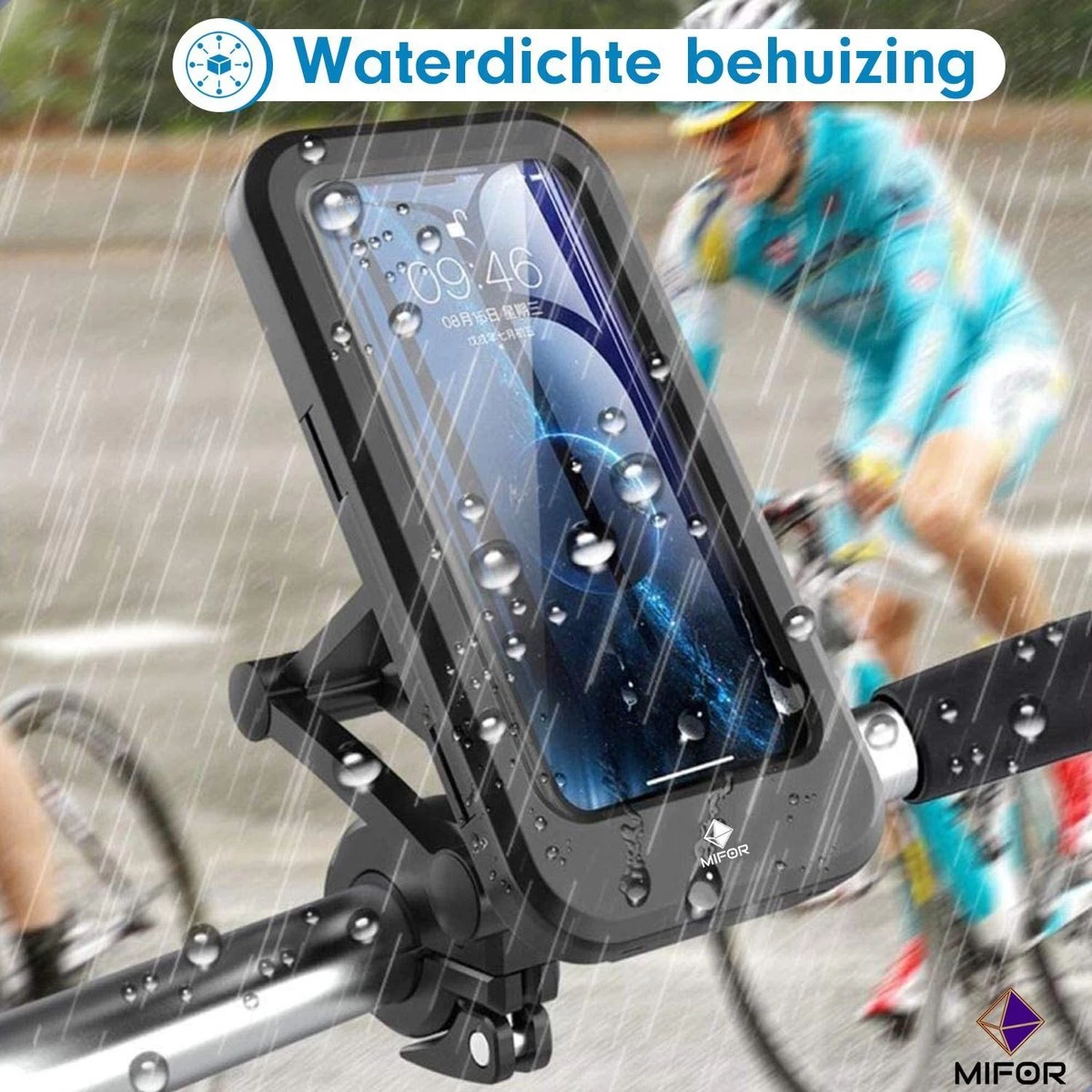 De ideale telefoonhouder voor elke telefoon gemonteerd aan uw fiets en ook nog eens waterdicht. Deze houder kan stevig worden gemonteerd aan uw fiets, kinderwagen of motor.