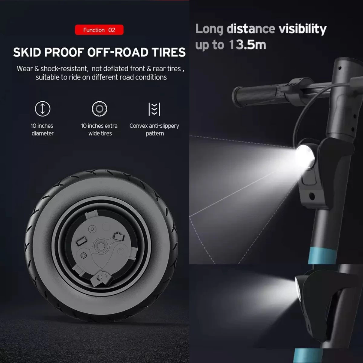 De 10-inch luchtbanden, met superieure schokabsorptie, maken uw rit soepeler en stabieler, zelfs op hobbelig terrein of ruwe oppervlakken. Met de 350W krachtige motor levert de M5 een snelle en stevige rijervaring.