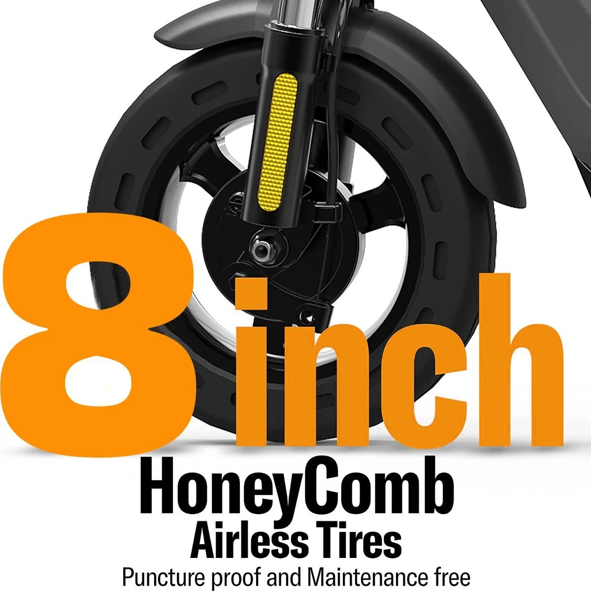 SUOTU Series (Rytigo 6) elektrische scooter ontworpen voor volwassenen met de nieuwste technologie en geselecteerde hoogwaardige materialen, het is niet alleen een vervoermiddel, maar ook een stijlvolle sportuitrusting. 8 inch rubberen banden met honingraat binnenwerk. Het schokabsorberende effect en de slijtvastheid worden hierdoor effectief verbeterd. Vergeleken met kleinere banden presteren grotere banden beter bij het overwinnen van obstakels en zorgen zij voor een beter zicht tijdens het rijden.