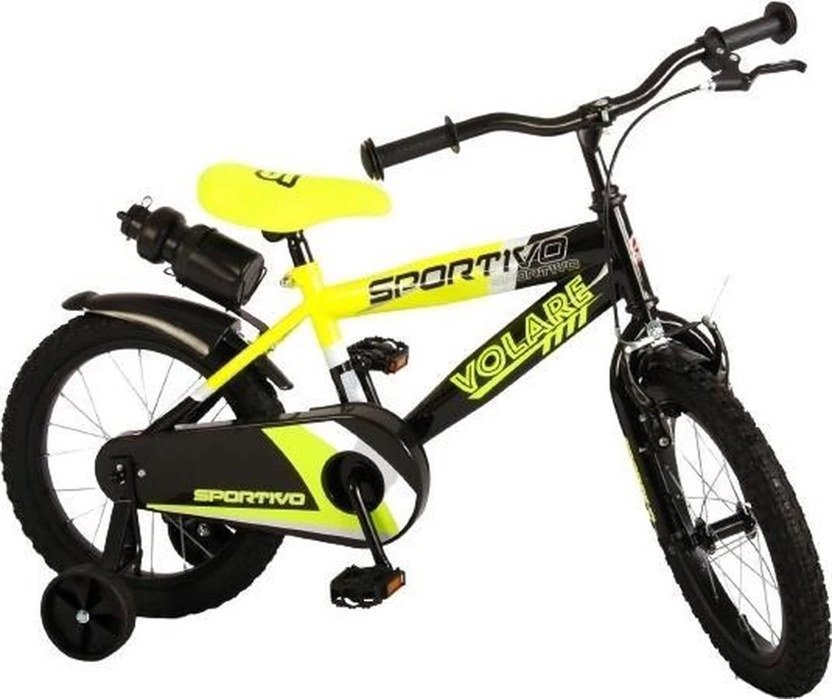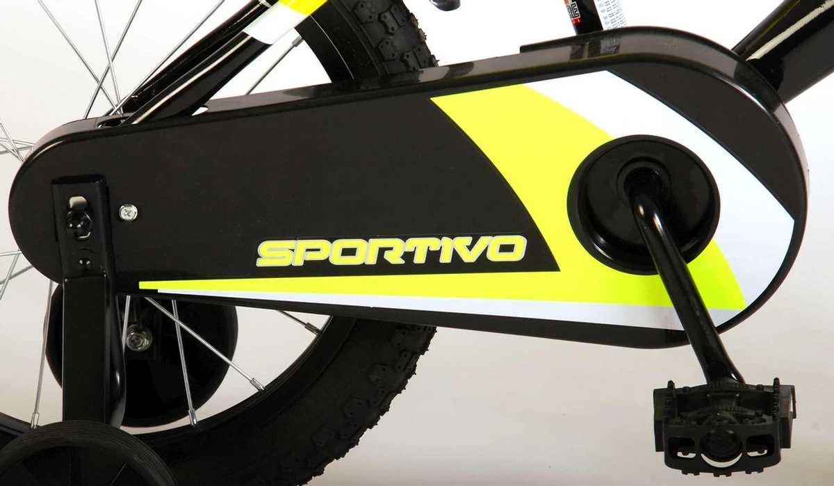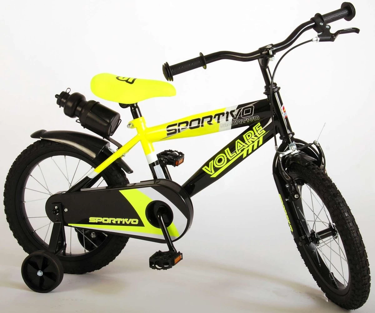 Het sterke stalen frame heeft met de stoere neon geel met zwarte kleurstelling een zeer sportieve uitstraling. Met de bidon in de praktische bidonhouder heeft je kind altijd iets te drinken bij zich. De spatborden houden al het opspattend vuil tegen. Om vaart te minderen heeft de fiets zowel een hand- als terugtraprem. Ter bescherming van de kleine vingertjes is de kettingkast gesloten. Dankzij de afneembare zijwielen is dit de ideale fiets om het fietsen te leren. De 16 inch luchtbanden maken de fiets geschikt voor stoere knullen tussen 4 en 6 jaar oud met kledingmaat 104-110.